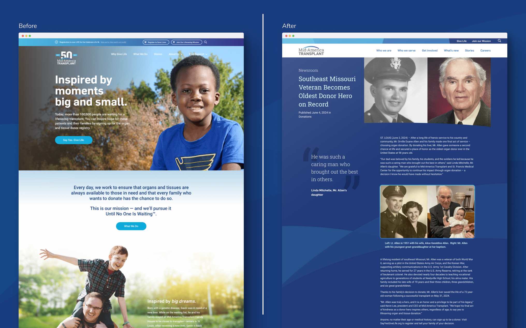 Previously, the organization’s digital presence was a decade-old legacy website that had grown organically over time without a clear strategic vision. This resulted in a site that was difficult for staff to update and a frustrating maze of information for users. For grieving families seeking resources or potential recipients looking for stories of hope, the outdated platform had become a barrier rather than a beacon of support.